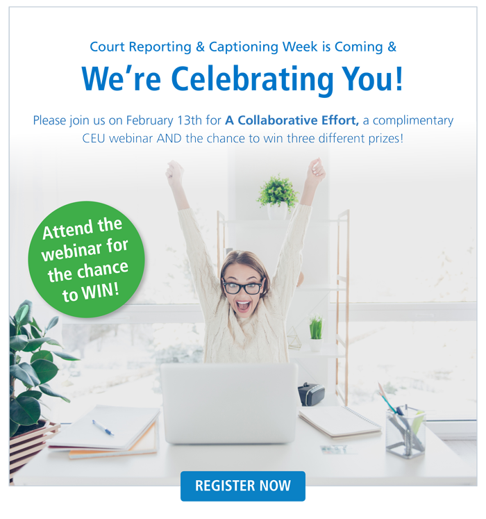 To celebrate court reporters during this time, Veritext will be hosting a complimentary CEU Webinar titled A Collaborative Effort: Investing in the Future of Our Profession. Additionally, immediately following the webinar three great prizes will be raffled off to attendees present!