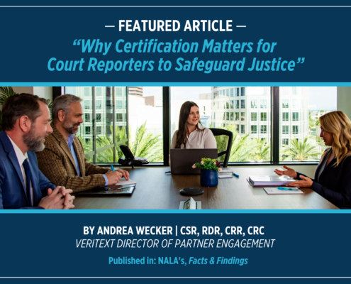 Olivia Payne2026-02-10 16:53:462026-03-03 16:36:38Veritext’s Andrea Wecker, CSR, RDR, CRR, CRC, Featured in NALA’s “Facts & Findings” Article, “Why Certification Matters for Court Reporters to Safeguard Justice”