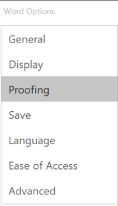 - A new window will appear. On the left side, you will see a pane of menus. Select Proofing.