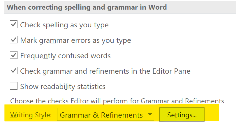 - Scroll down to When correcting spelling and grammar in Word