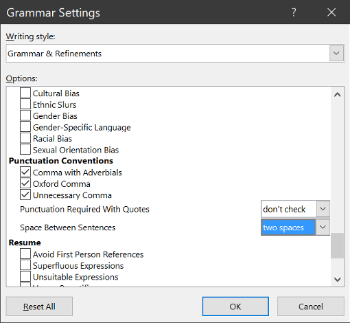 - The last option where is says Space Between Sentences select One Space or Two Spaces